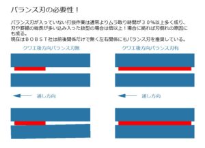 バランス刃が有無でムラトリ時間の差は大きいので後付のバランス刃は便利である。注意はバランス刃のエリアにムラトリ用紙が届いていない現場が多いのでバランス刃の意味がなくなるので、届かない場合には同じ厚みの素材シートをあらかじめ用意して取り付けて欲しい。