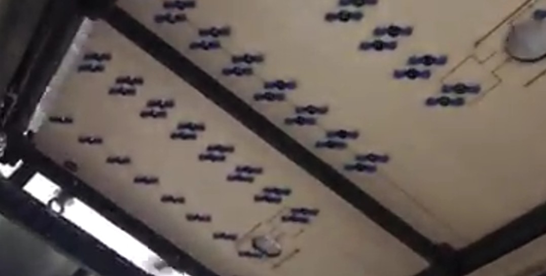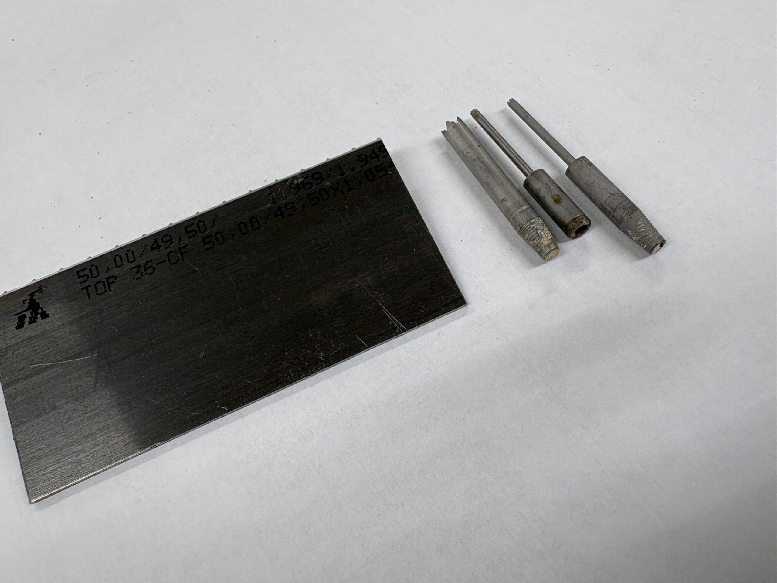 上記図面は8パイ64個下ピン無しのオン型メン型の図面です。8パイ丸刃には0.1mmニック4ヵ所配置されています。下ピン無しの場合は穴カスが保持されたまま、ストリッピング部に配送されなくてはいけないのでニックが必要です。0.1ニック入れ丸刃は刃物メーカーさんで販売しています。非常に丸穴間隔が狭いのでスピードピンしか対応は出来ません。図面データー依頼いただければ無償提供致します。